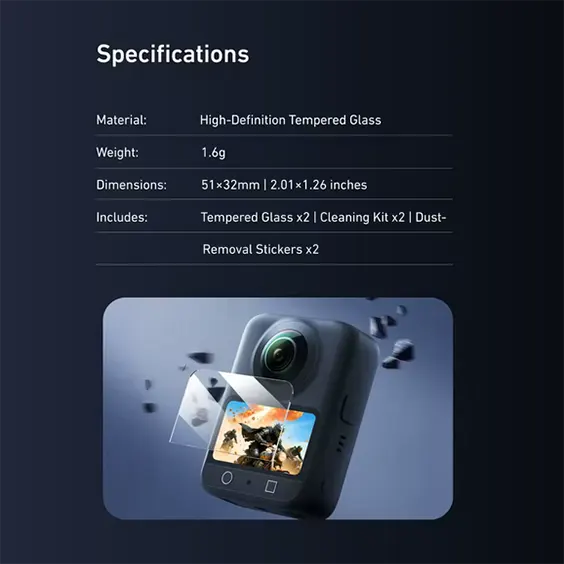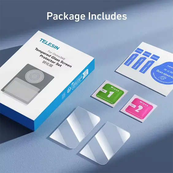 В комплекта 2 бр. защитна слюда и сет за почистване и поставяне към екрана на камерата.