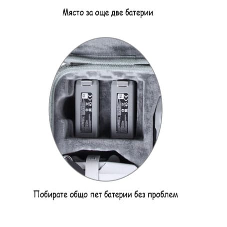 В чантата има две отделни прегради,в тях вие можете да поберете всички необходими аксесоари за дрона,